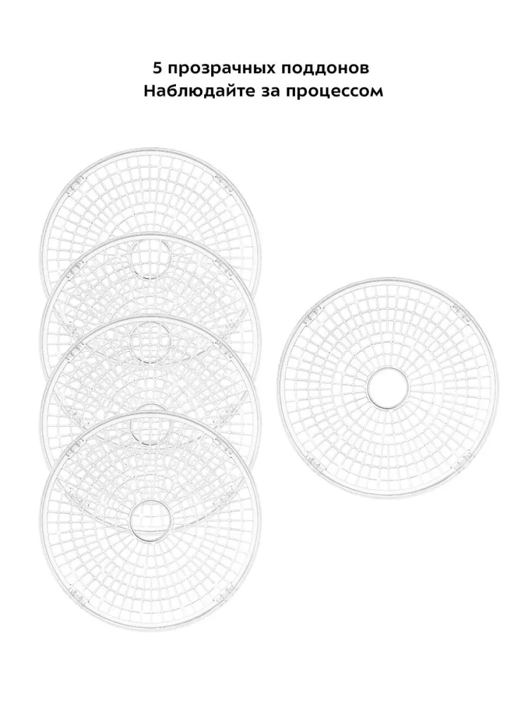 Сушилка имеет в комплекте 5 поддонов из прозрачного пластика, поэтому вы легко можете наблюдать за процессом сушки.