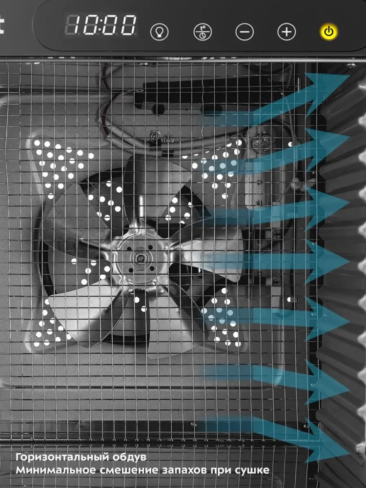 В сушилке установлен мощный нагревательный элемент и вентилятор большого диаметра, обеспечивающий равномерное распределение нагретого воздуха по всему объему камеры. Благодаря горизонтальному обдуву смешение запахов при сушке одновременно разных продуктов минимально.