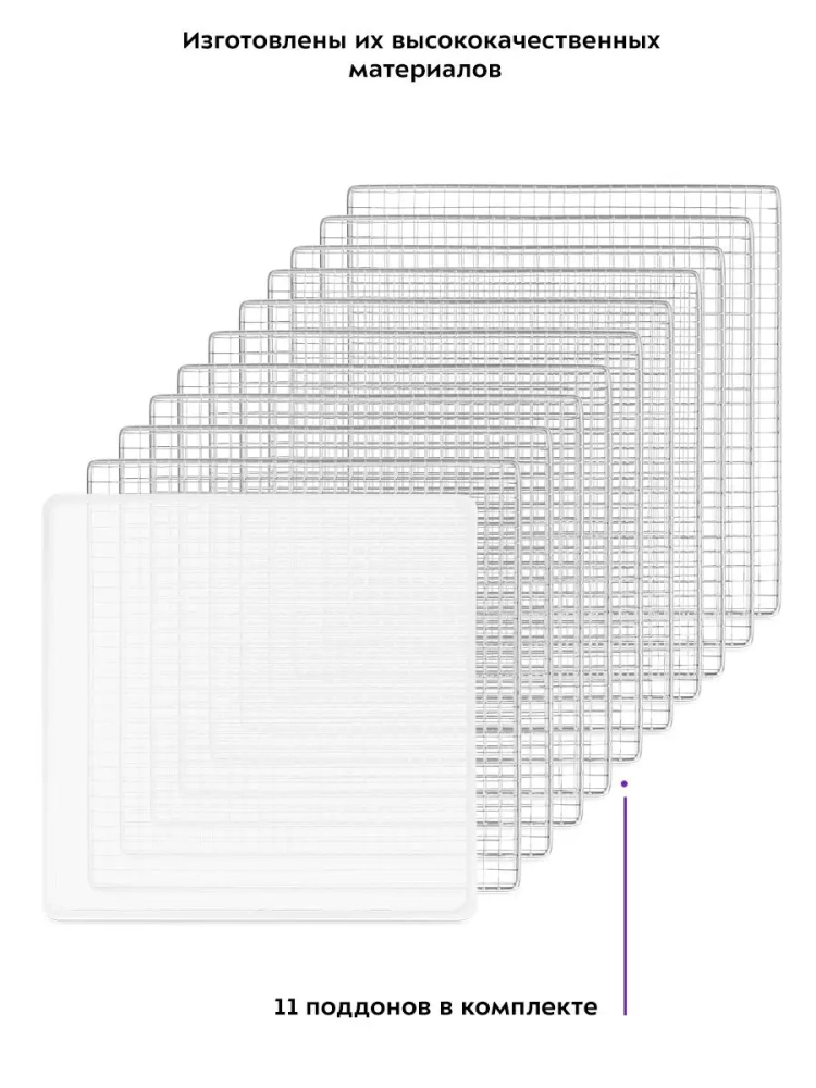 Сушилка имеет в комплекте 10 поддонов для сушки и 1 поддон для жидкости. Поддоны для сушки выполнены из нержавеющей стали.
