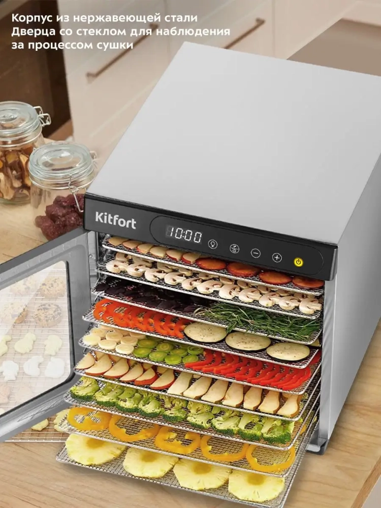 Электрическая сушилка Kitfort КТ-1954 предназначена для сушки овощей, фруктов, ягод, грибов, корнеплодов, трав и зелени, а также мяса и рыбы, хлеба.
