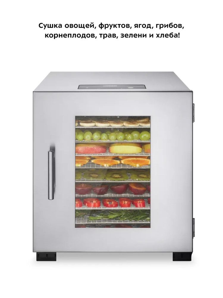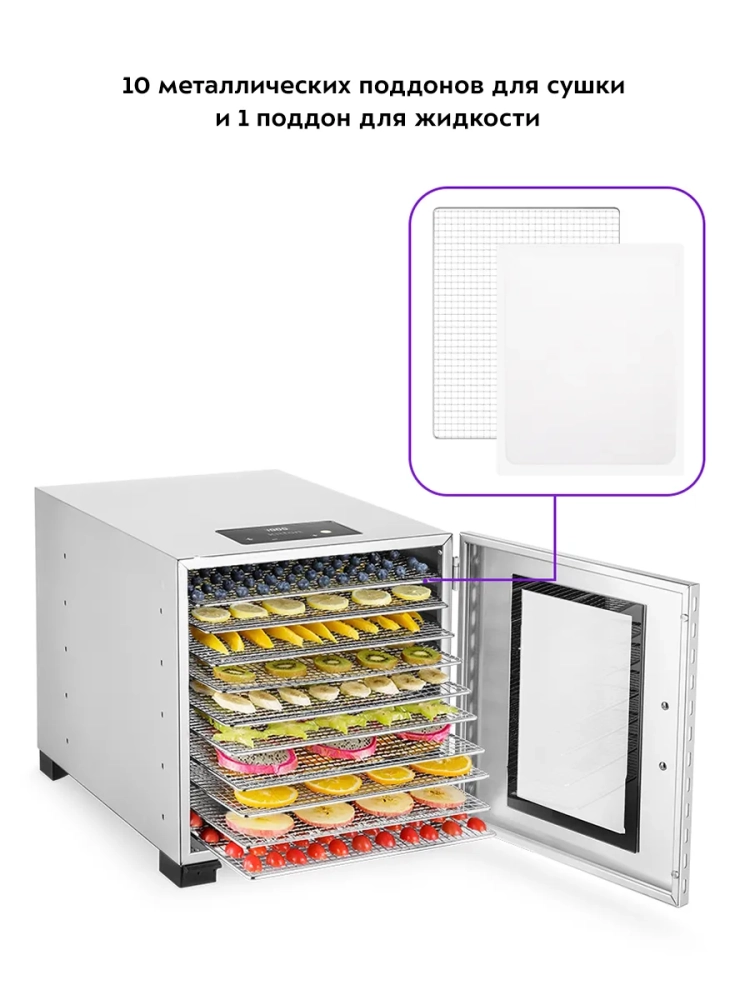 Сушилка имеет в комплекте 10 поддонов для сушки и 1 поддон для жидкости. Поддоны для сушки выполнены из нержавеющей стали.