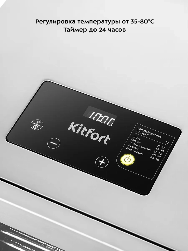 Электрическая сушилка Kitfort КТ-1955 предназначена для сушки овощей, фруктов, ягод, грибов, корнеплодов, трав и зелени, а также мяса и рыбы, хлеба.