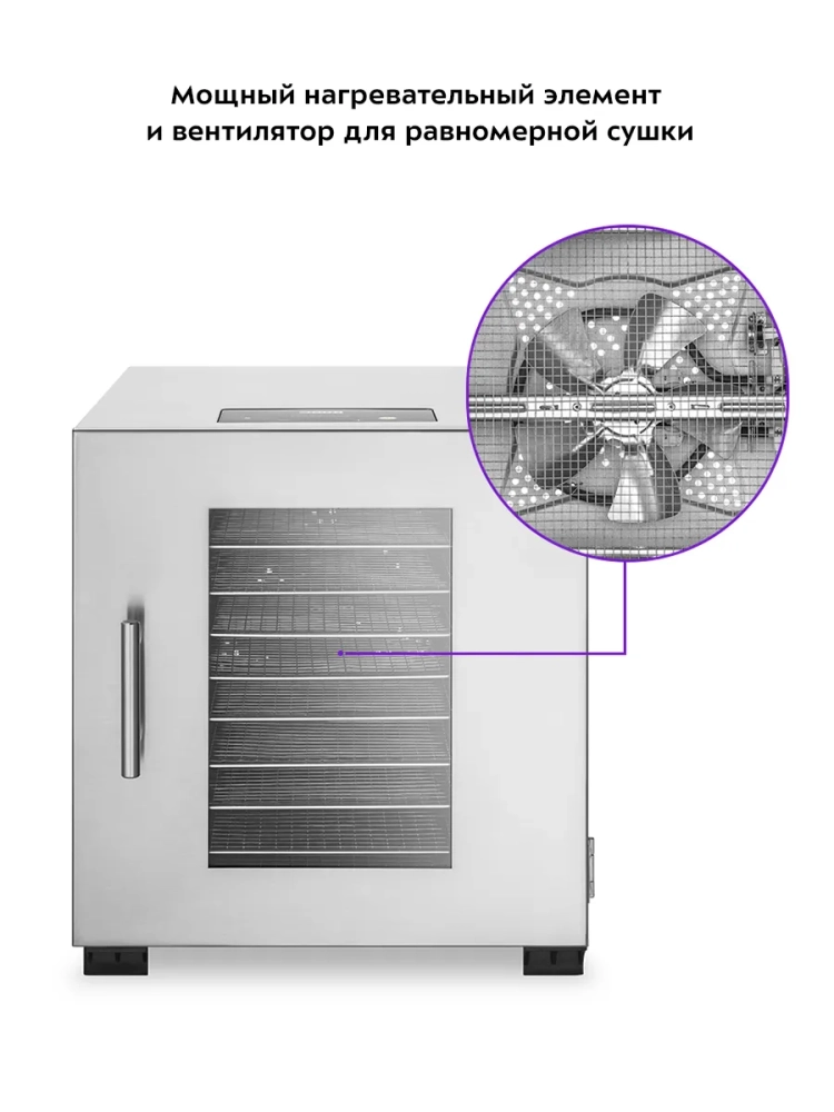 В сушилке установлен мощный нагревательный элемент и вентилятор большого диаметра, обеспечивающий равномерное распределение нагретого воздуха по всему объему камеры. Благодаря горизонтальному обдуву смешение запахов при сушке одновременно разных продуктов минимально.