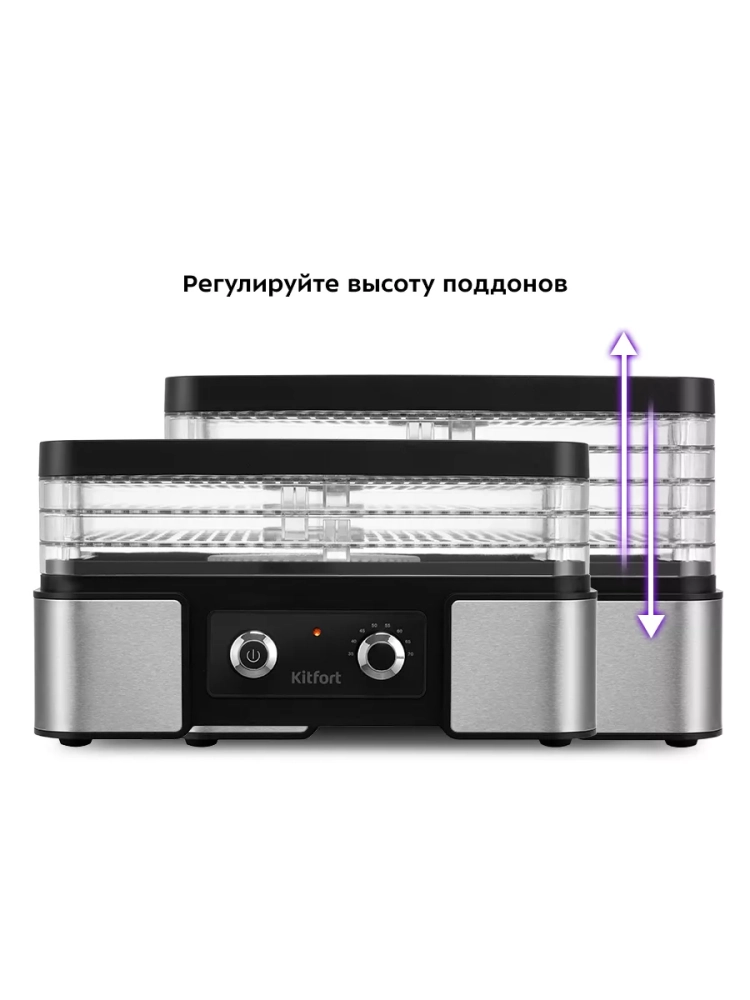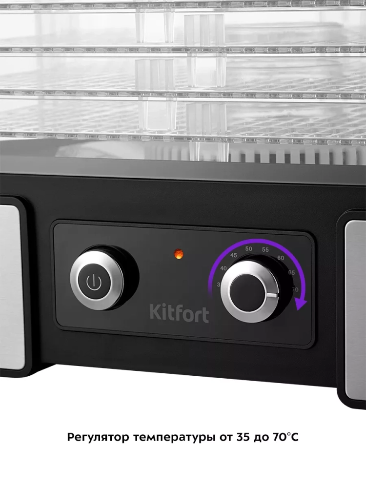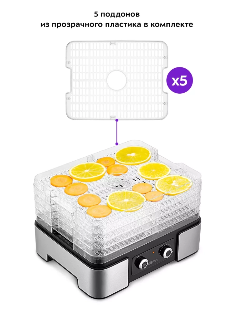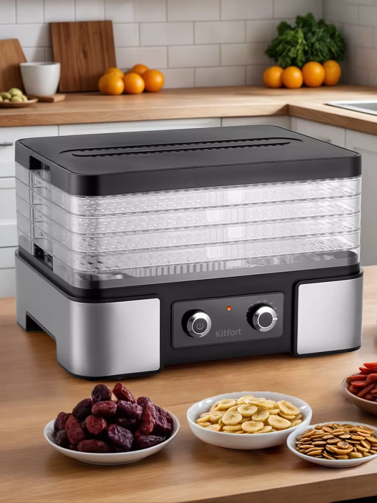 Электрическая сушилка Kitfort КТ-1958 предназначена для сушки овощей, фруктов, ягод, грибов, корнеплодов, трав и зелени, а также хлеба.