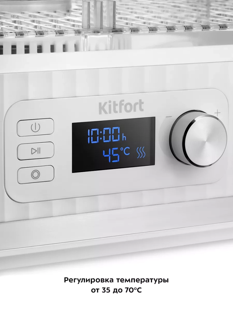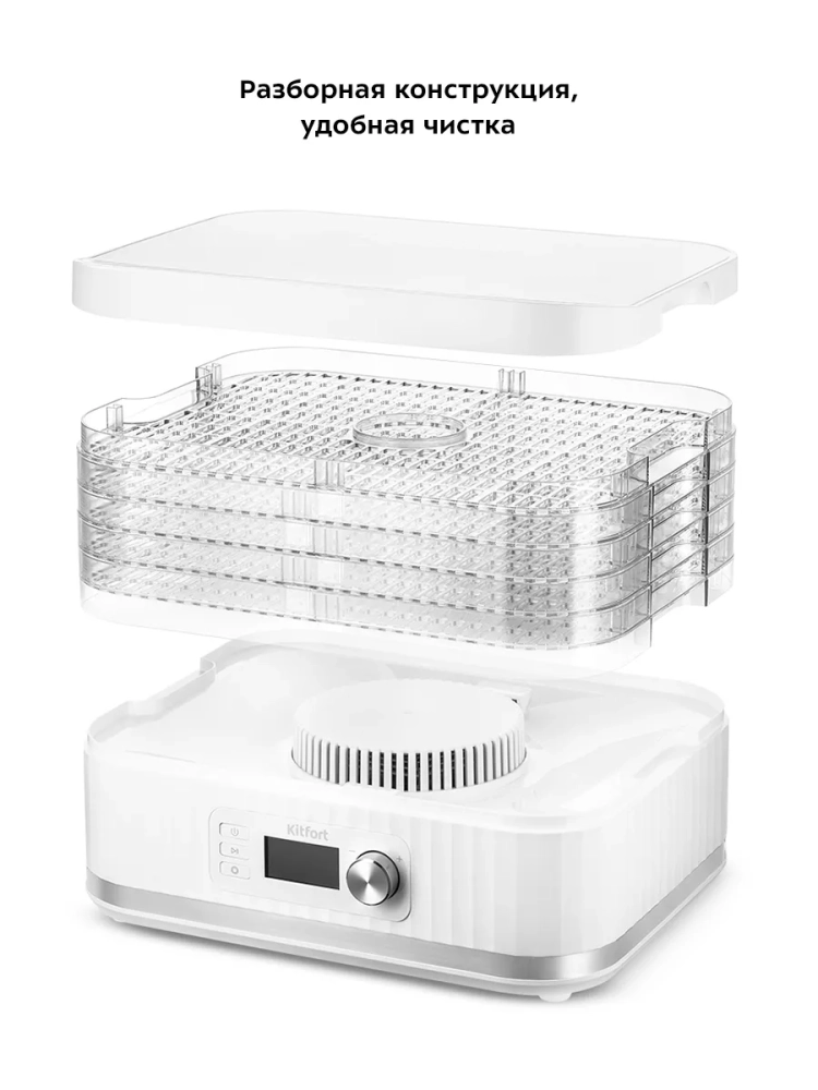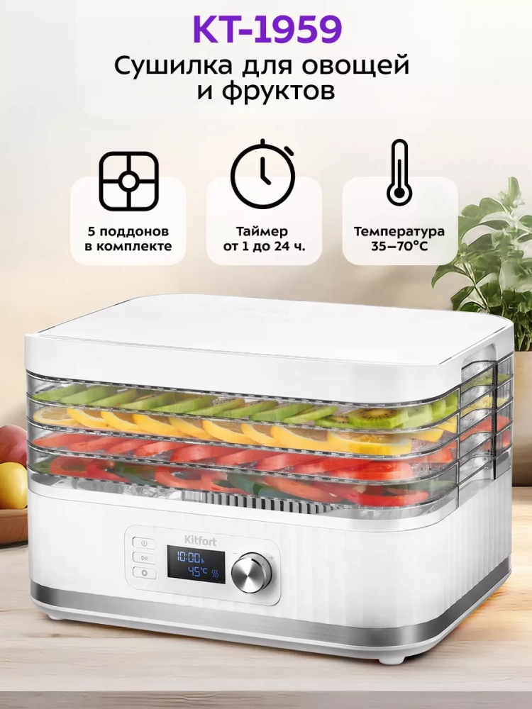 Электрическая сушилка для овощей и фруктов Kitfort КТ-1959 предназначена для сушки овощей, фруктов, ягод, грибов, корнеплодов, трав и зелени, а также хлеба.
