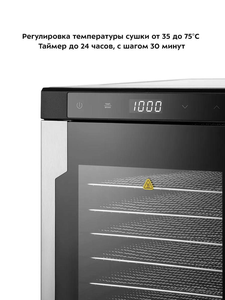 На сушилке можно установить температуру сушки в диапазоне 35–75 *С с шагом 5 градусов. Сушилка оснащена таймером до 24 часов работы с шагом 30 минут.
