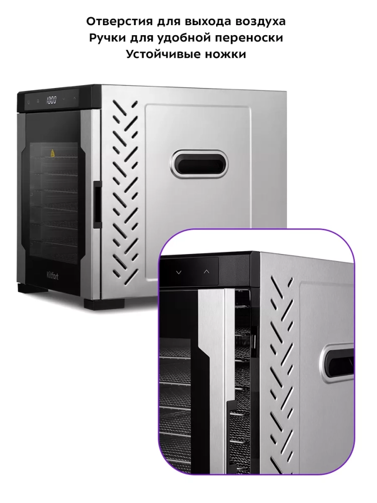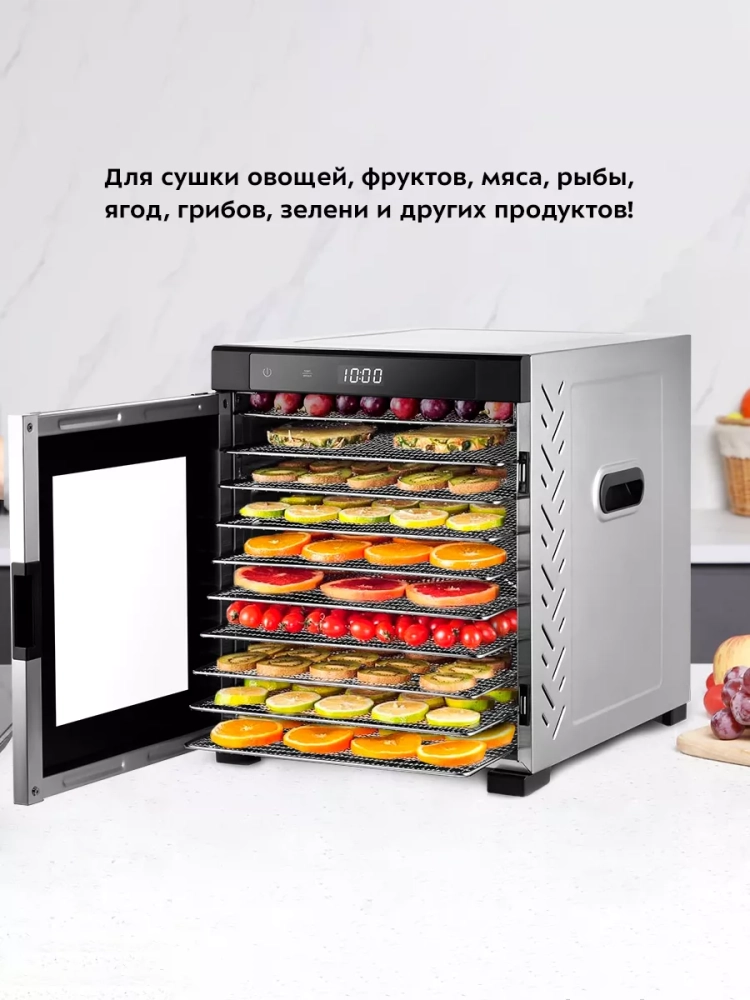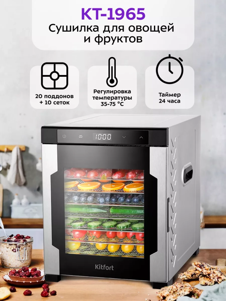 Электрическая сушилка Kitfort КТ-1965 предназначена для сушки овощей, фруктов, ягод, грибов, корнеплодов, трав и зелени, а также мяса и рыбы, хлеба. С помощью специальных сплошных поддонов можно готовить пастилу.