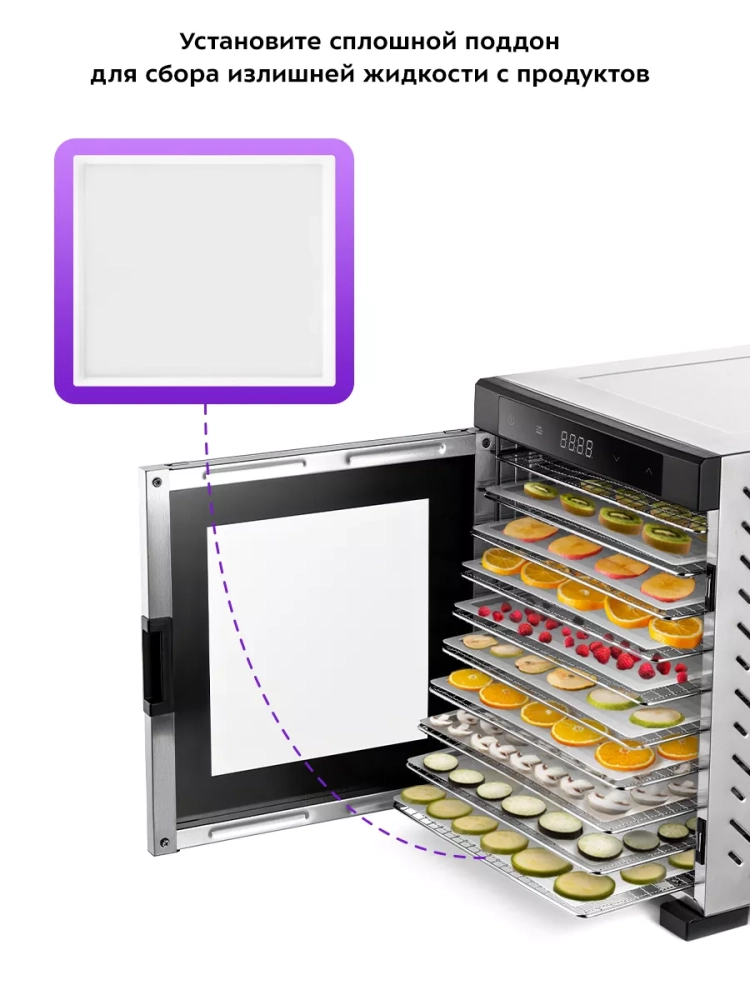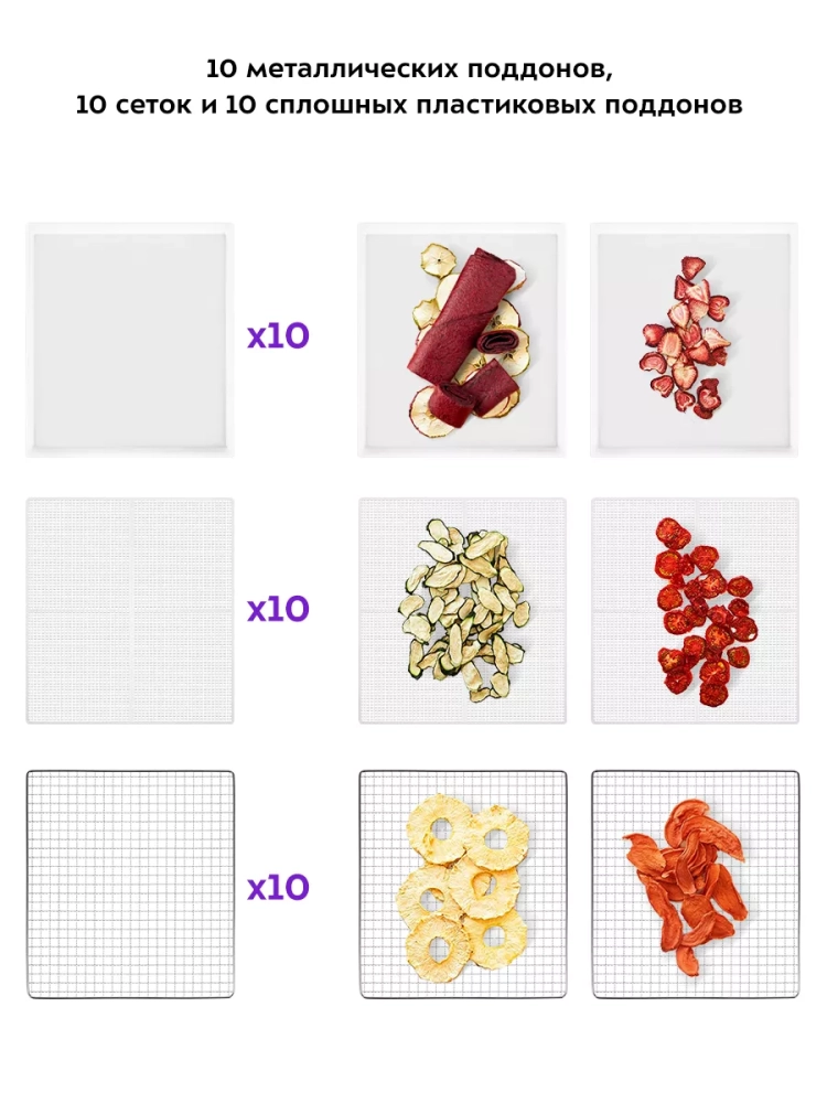 В комплекте к сушилке идут 10 металлических поддонов, 10 сеток для мелких продуктов и 10 сплошных пластиковых поддонов.