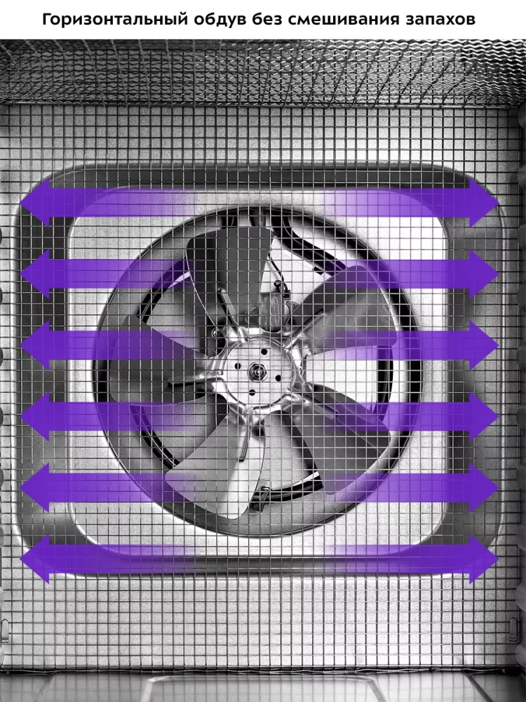 В сушилке установлен мощный нагревательный элемент и вентилятор с лопастями большого диаметра, обеспечивающий равномерное распределение нагретого воздуха по всему объему камеры. Благодаря горизонтальному обдуву смешение запахов при сушке одновременно разных продуктов минимально.