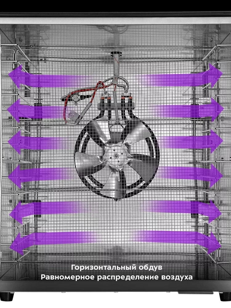 В сушилке установлен мощный нагревательный элемент и вентилятор с лопастями большого диаметра, обеспечивающий равномерное распределение нагретого воздуха по всему объему камеры. Благодаря горизонтальному обдуву смешение запахов при сушке одновременно разных продуктов минимально.