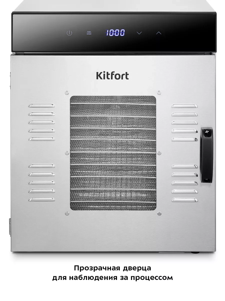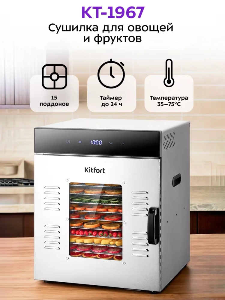 Электрическая сушилка Kitfort КТ-1967 предназначена для сушки овощей, фруктов, ягод, грибов, корнеплодов, трав и зелени, а также мяса и рыбы, хлеба.