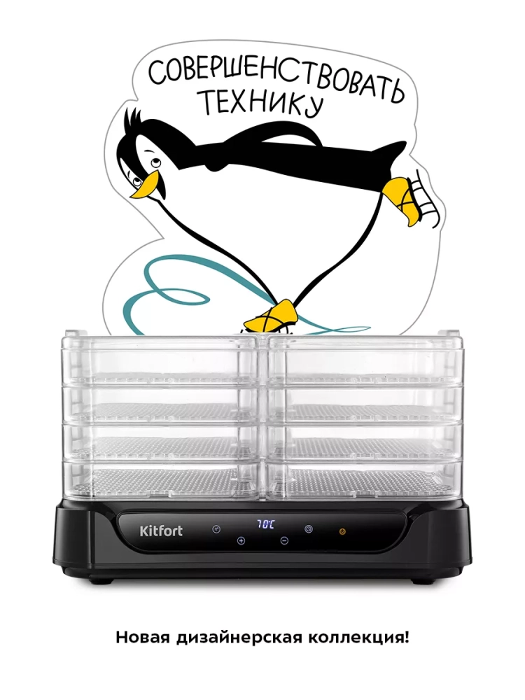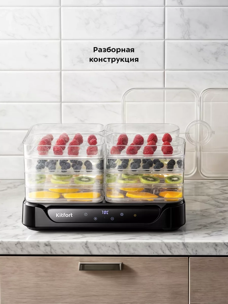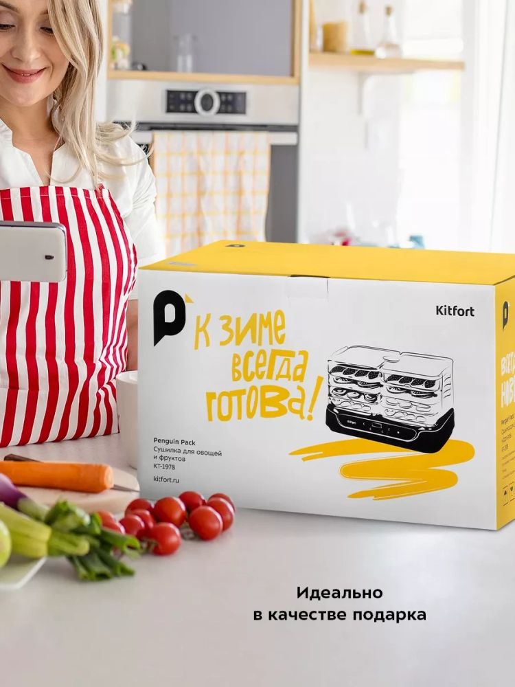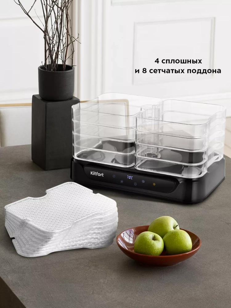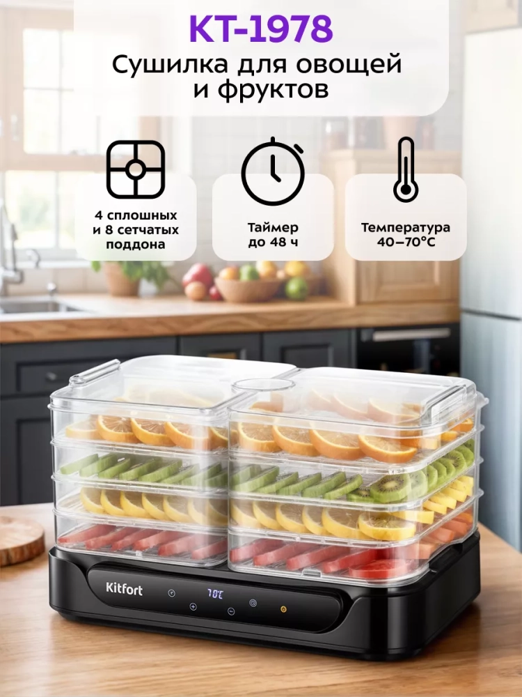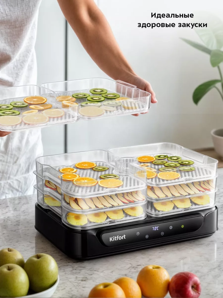 Электрическая сушилка для овощей и фруктов Kitfort КТ-1978 предназначена для сушки овощей, фруктов, ягод, грибов, корнеплодов, трав и зелени, а также хлеба.