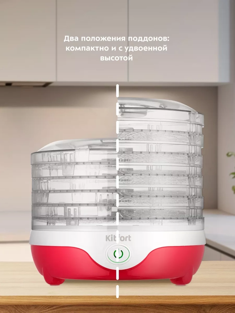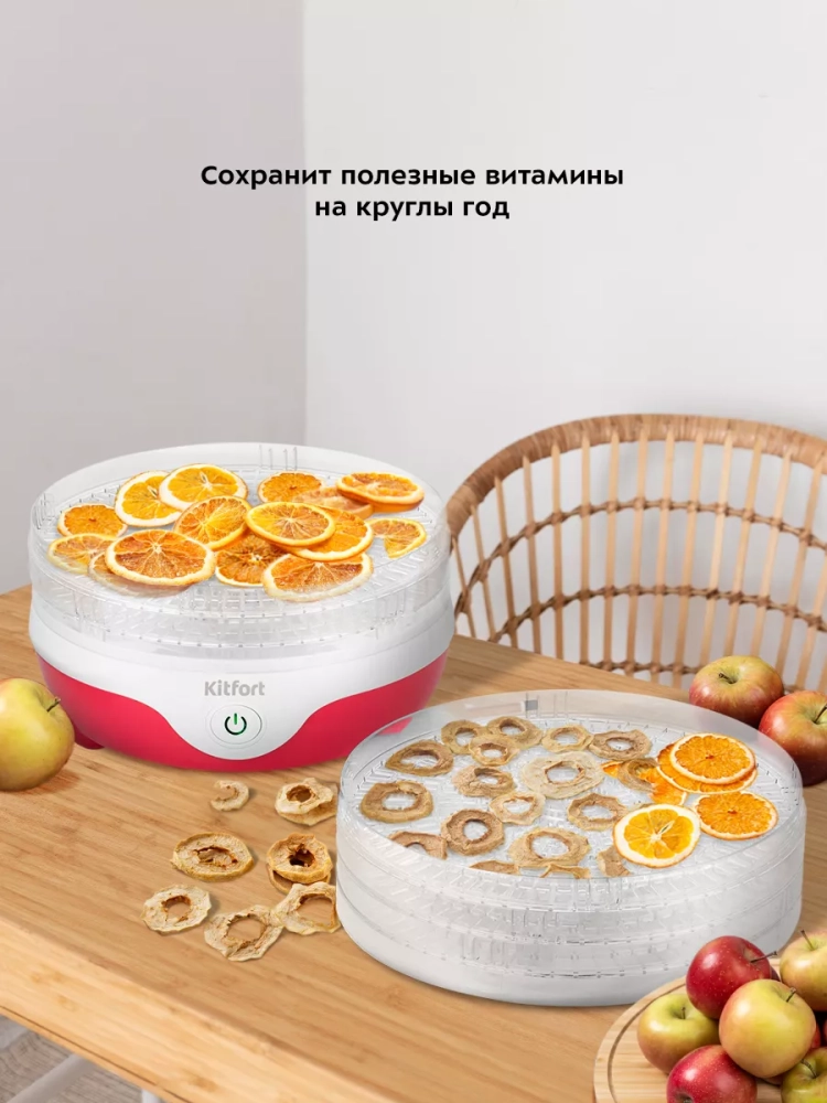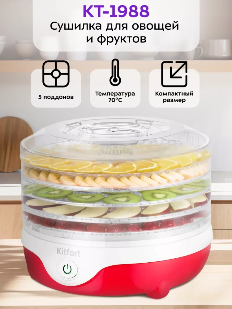 Электрическая сушилка Kitfort КТ-1988 предназначена для сушки овощей, фруктов, ягод, грибов, корнеплодов, трав и зелени, а также хлеба.