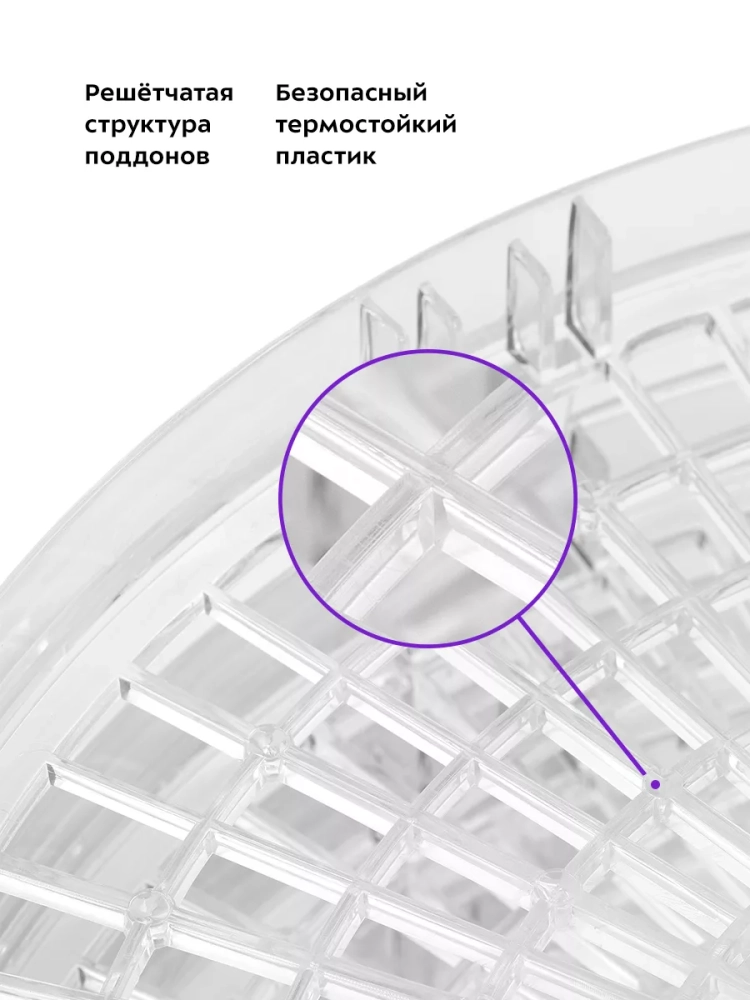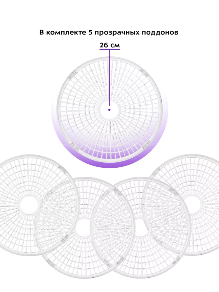 Сушилка имеет в комплекте 5 прозрачных поддонов из пластика и крышку.