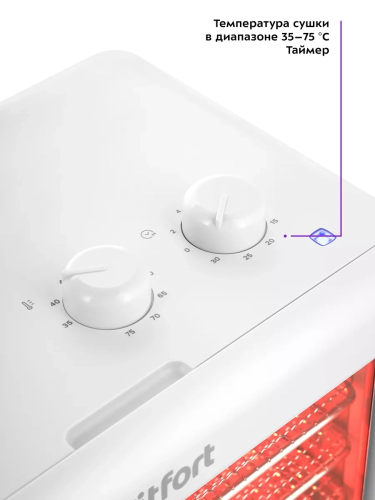 В сушилке установлен галогеновый нагреватель, а также вентилятор, обеспечивающий равномерное распределение нагретого воздуха по всему объему камеры. Благодаря горизонтальному обдуву смешение запахов при сушке одновременно разных продуктов минимально. Галогеновый нагреватель также подсвечивает камеру сушилки во время работы прибора.