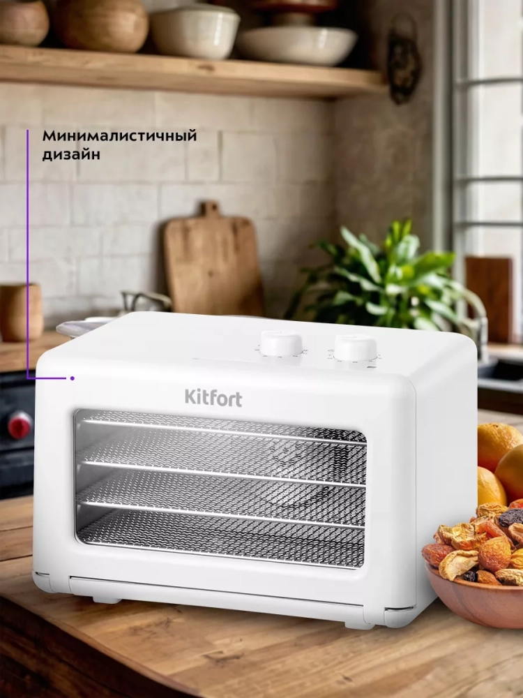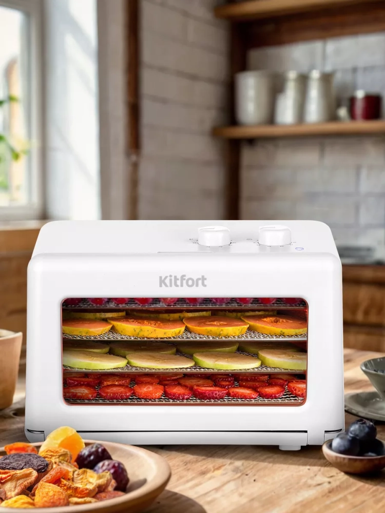 Электрическая сушилка Kitfort КТ-1993 предназначена для сушки овощей, фруктов, ягод, грибов, корнеплодов, трав и зелени, а также мяса и рыбы, хлеба. С помощью специальных сплошных поддонов можно готовить пастилу.