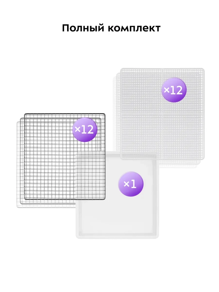 В комплект входит 5 металлических поддонов, 5 сплошных пластиковых поддонов и 5 сеток.