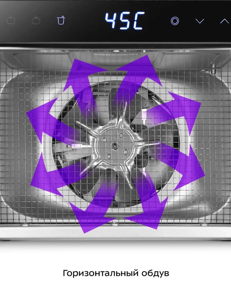 В сушилку установлен нагревательный элемент и вентилятор, обеспечивающий равномерное распределение нагретого воздуха по всему объему камеры. Благодаря горизонтальному обдуву смешение запахов при одновременной сушке разных продуктов минимально.