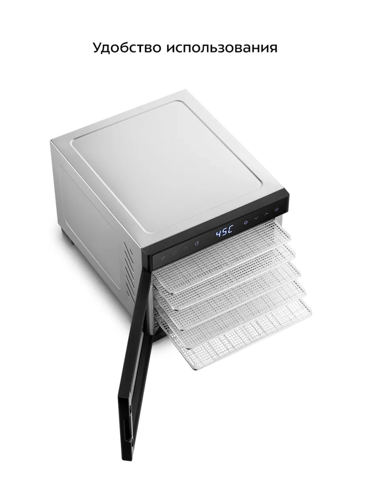 В данной модели предусмотрено 4 автоматических режима работы: «Мясо», «Овощи», «Фрукты» и «Йогурт». В каждом режиме вы можете настроить температуру сушки от 35 до 80 °С. В режимах «Мясо», «Овощи», «Фрукты» можно установить таймер от 30 минут до 48 часов. В режиме «Йогурт» предусмотрены другие настройки таймера: от 4 до 48 часов. Шаг установки температуры и времени работы во всех режимах — 1 °С и 30 минут соответственно.