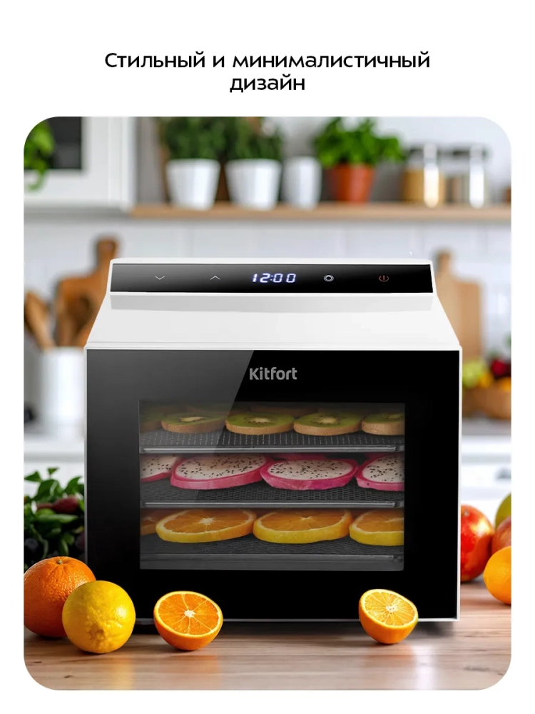 Электрическая сушилка Kitfort KT-4952 предназначена для сушки овощей, фруктов, ягод, грибов, корнеплодов, трав и зелени, а также мяса, хлеба и рыбы.