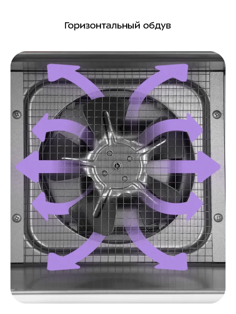 В сушилку установлен нагревательный элемент и вентилятор, обеспечивающий равномерное распределение нагретого воздуха по всему объему камеры. Благодаря горизонтальному обдуву смешение запахов при одновременной сушке разных продуктов минимально.