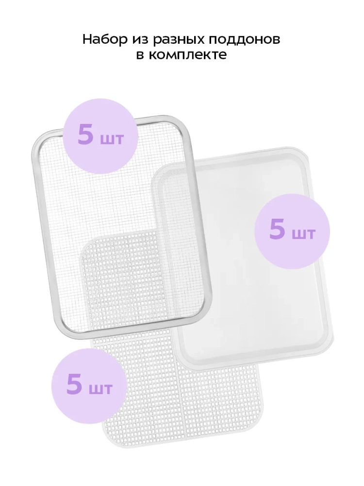 В комплект входят 5 металлических поддонов, 5 сплошных пластиковых поддонов и 5 сеток.