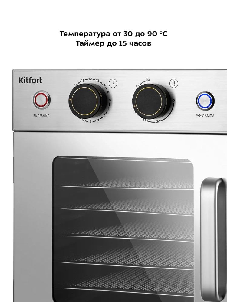 Температуру сушки можно изменить от 30 до 90 °С. Сушилка оснащена таймером до 15 часов работы.