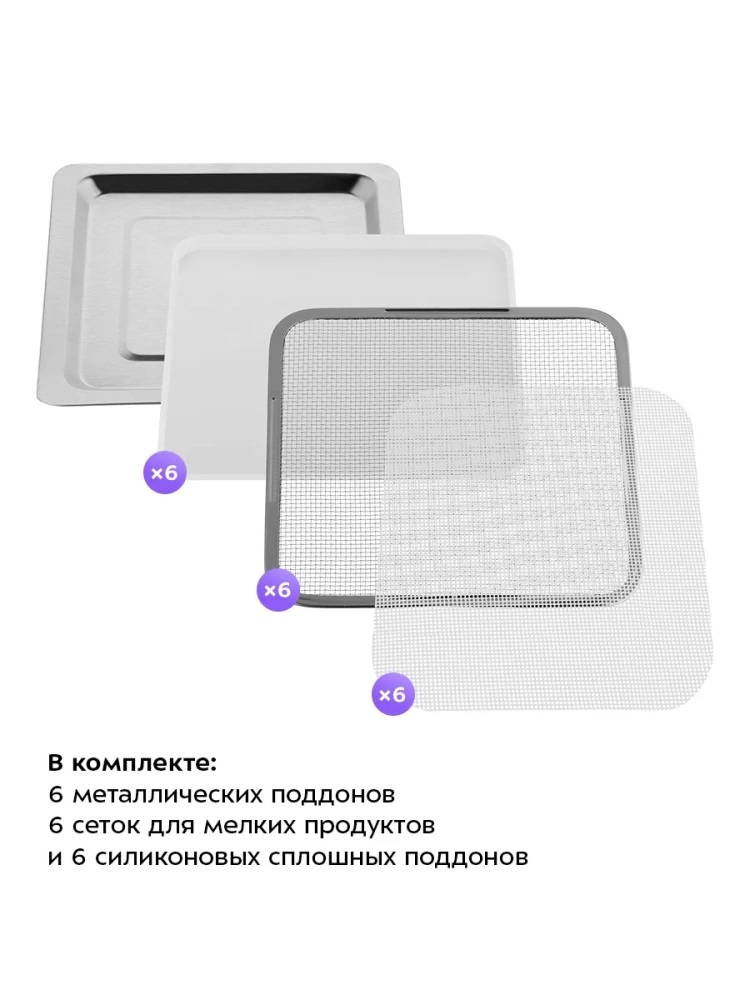 Сушилка имеет в комплекте 6 металлических поддонов, 6 сеток для мелких продуктов и 6 силиконовых сплошных поддонов. Также в комплект входит 1 поддон для жидкости, который облегчает очистку устройства: на поддон попадают остатки от продуктов и сок, после чего поддон легко достать и очистить, а дно камеры сушилки остается чистым.