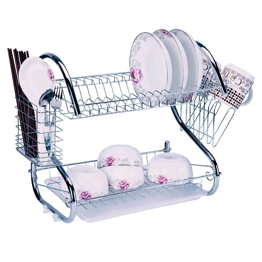 Верхний ярус предназначен для хранения тарелок, мисок и других блюд, в то время как нижний можно использовать для сушки посуды и стаканов Также с обеих сторон предусмотрены места для столовых приборов и кружек. Высококачественный 2-х ярусный хромированный осушитель для посуды. Держите все кухонные принадлежности и чашки в чистоте, сухости и легко мойте.