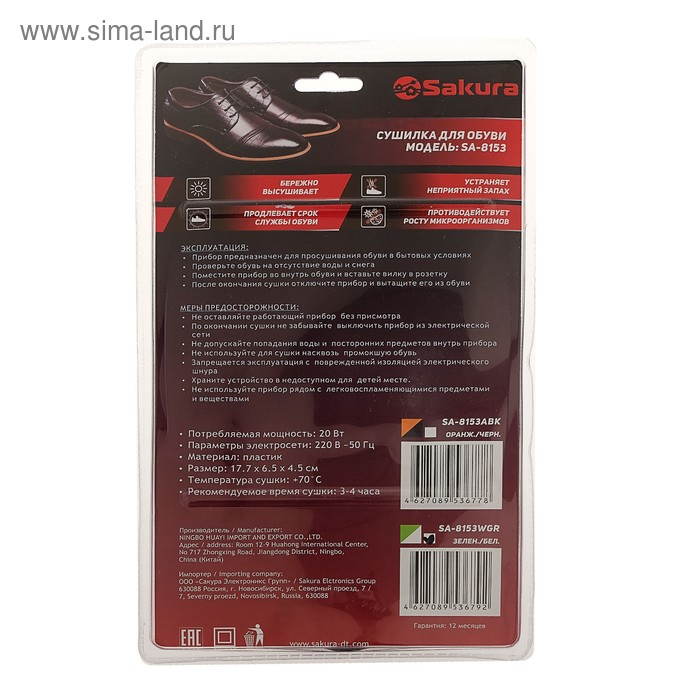 Сушилка для обуви Sakura SA-8153WGR, 60-75°С, арома-пластик, антибакт., зелено-белый