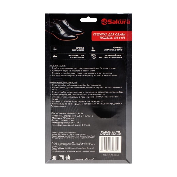 Сушилка для обуви Sakura SA-8158, 75°С, пластик, красный