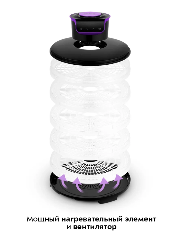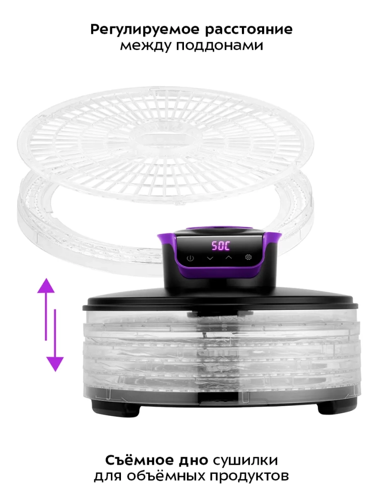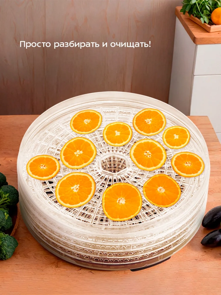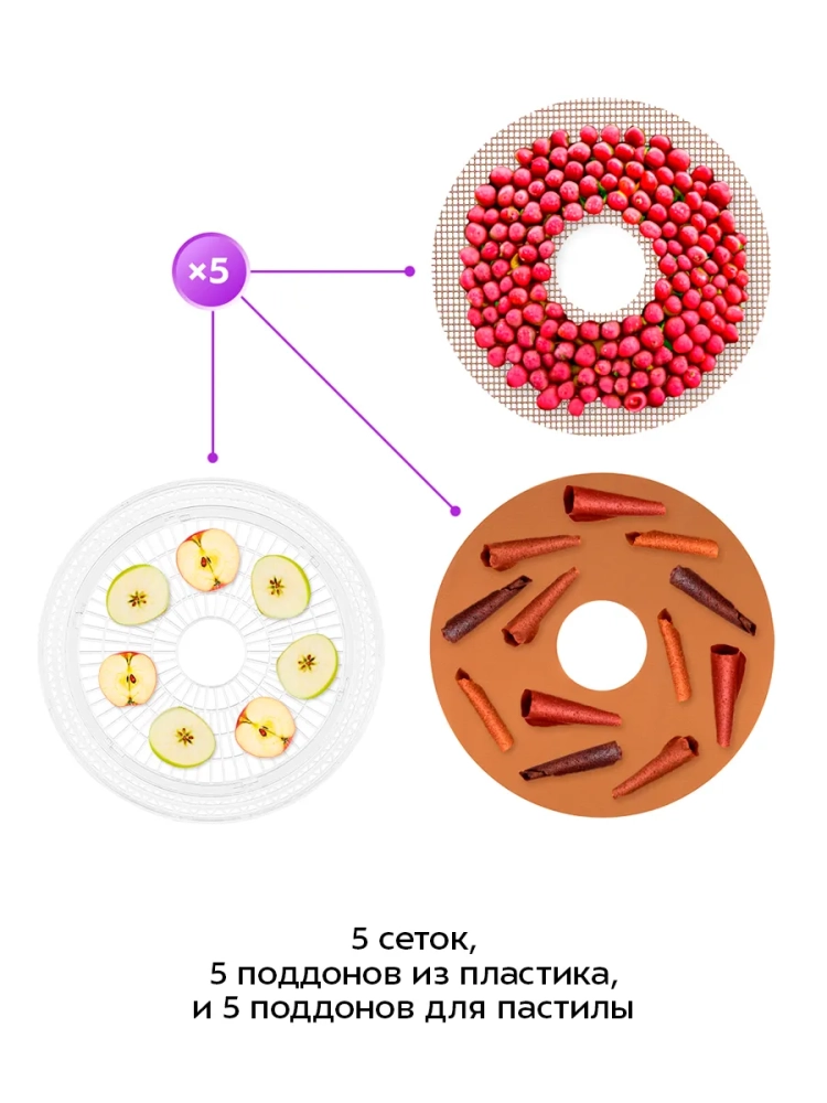В комплект сушилки входят 5 поддонов из пластика, 5 сеток и 5 поддонов для пастилы. Расстояние между пластиковыми поддонами можно регулировать. Также 4 пластиковых поддона имеют съемное дно, чтобы вы могли сушить объемные продукты.