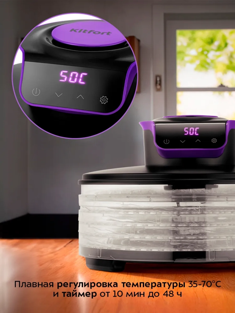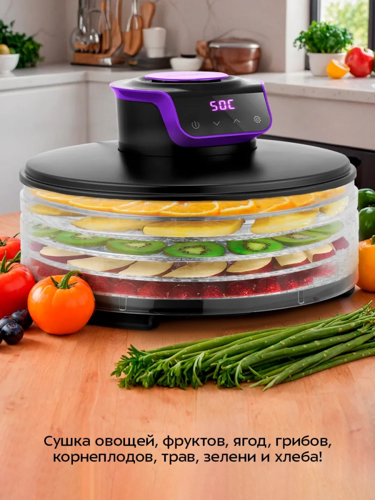 Электрическая сушилка для овощей и фруктов Kitfort КТ-1996 предназначена для сушки овощей, фруктов, ягод, грибов, корнеплодов, трав и зелени, а также хлеба.