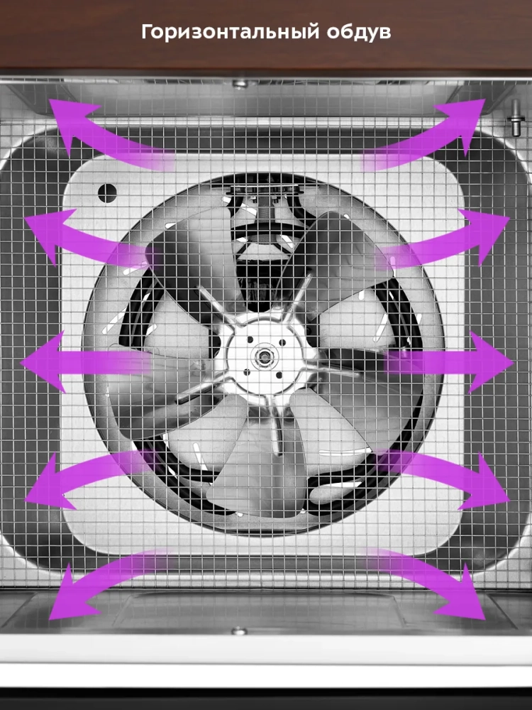 В сушилке установлен нагревательный элемент, а также вентилятор, обеспечивающий равномерное распределение нагретого воздуха по всему объему камеры. Благодаря горизонтальному обдуву смешение запахов при одновременной сушке разных продуктов минимально.