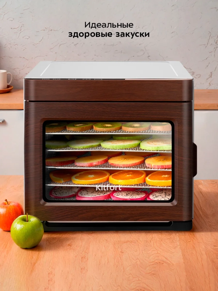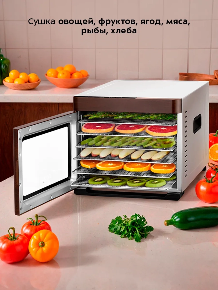Электрическая сушилка Kitfort KT-4942 предназначена для сушки овощей, фруктов, ягод, грибов, корнеплодов, трав и зелени, а также мяса и рыбы, хлеба.