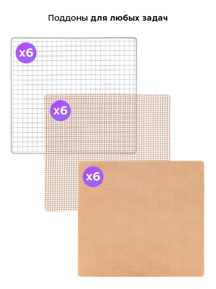В комплект сушилки входят 6 металлических поддонов, 6 сплошных пластиковых поддонов и 6 сеток для сушки мелких продуктов.