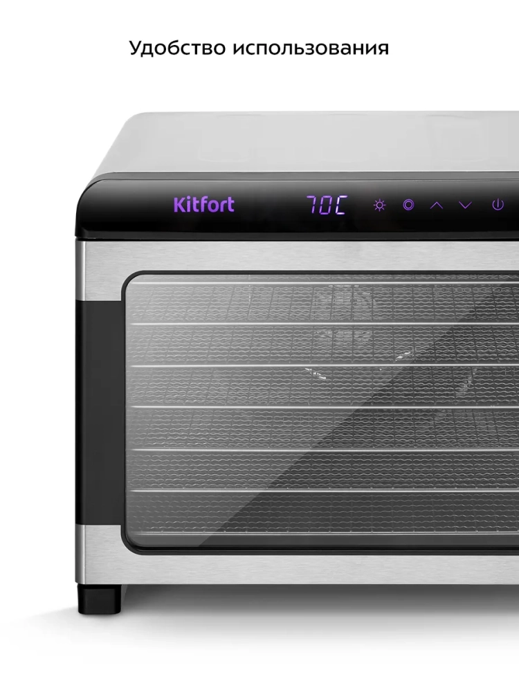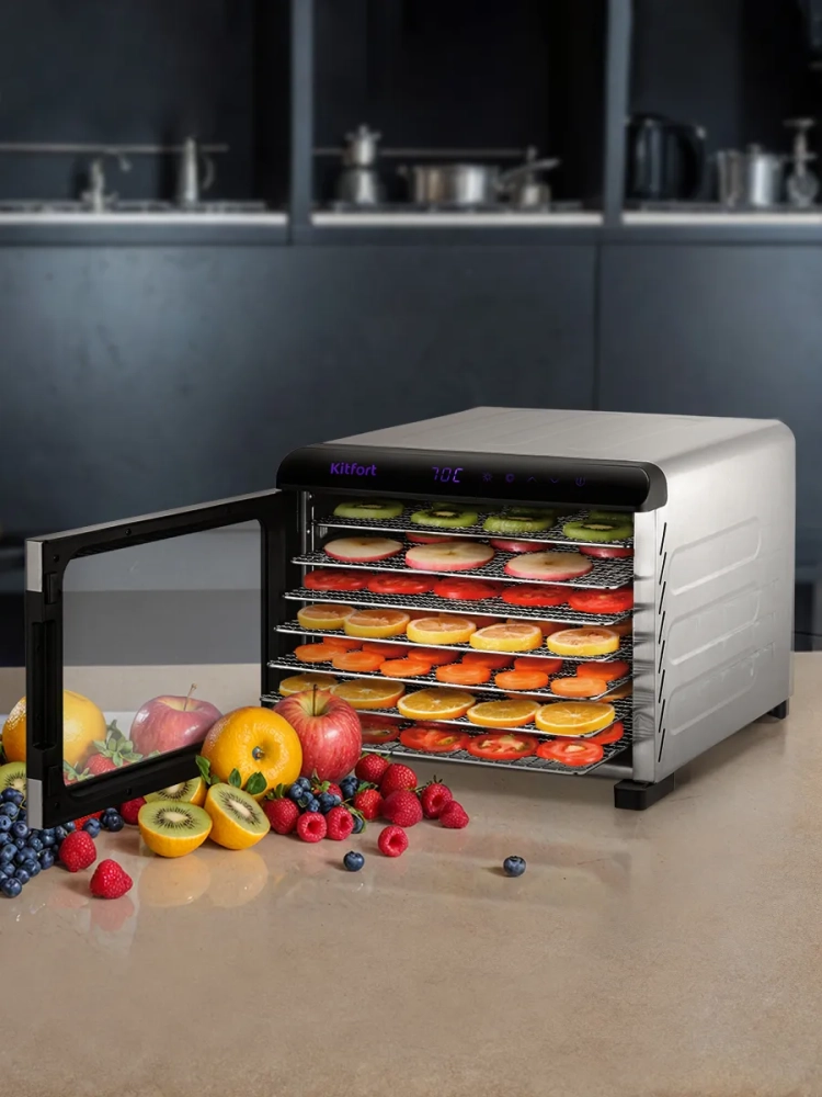 Электрическая сушилка Kitfort КТ-4956 предназначена для сушки овощей, фруктов, ягод, грибов, корнеплодов, трав и зелени, а также мяса и рыбы, хлеба.