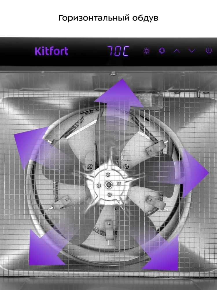 В сушилку установлен мощный нагревательный элемент и вентилятор, обеспечивающий равномерное распределение нагретого воздуха по всему объему камеры. Благодаря горизонтальному обдуву смешение запахов при сушке одновременно разных продуктов минимально.