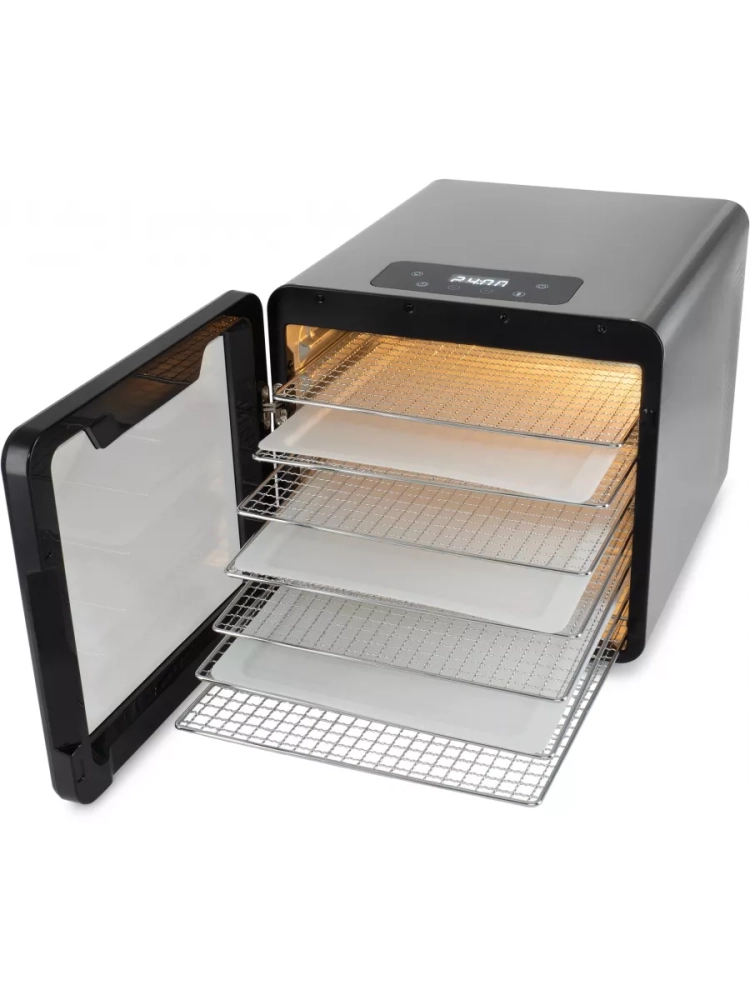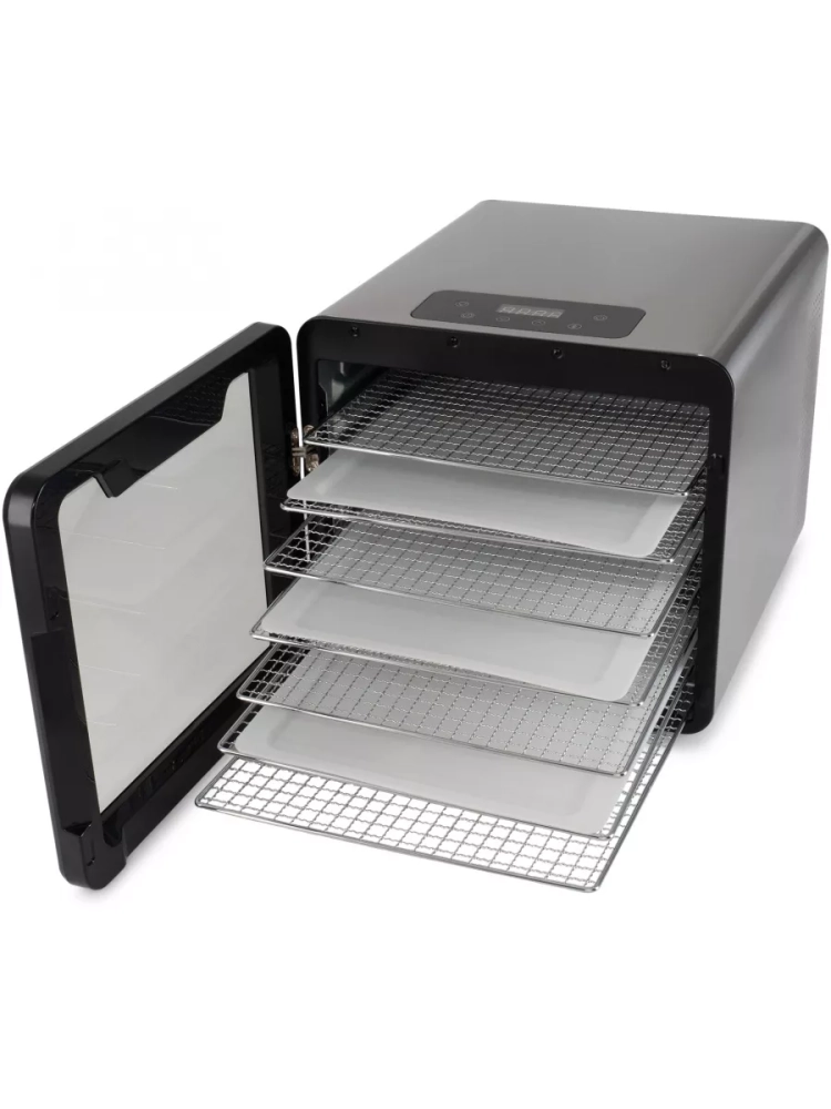 С 14 вместительными поддонами, Вы сможете одновременно обрабатывать большое количество овощей, фруктов, грибов и трав, вялить мясо или рыбу, экономя время и усилия. Диапазон регулировки температуры от 30 °С до 75 °С позволяет подобрать оптимальный режим для каждого вида продуктов, обеспечивая равномерную и эффективную сушку.