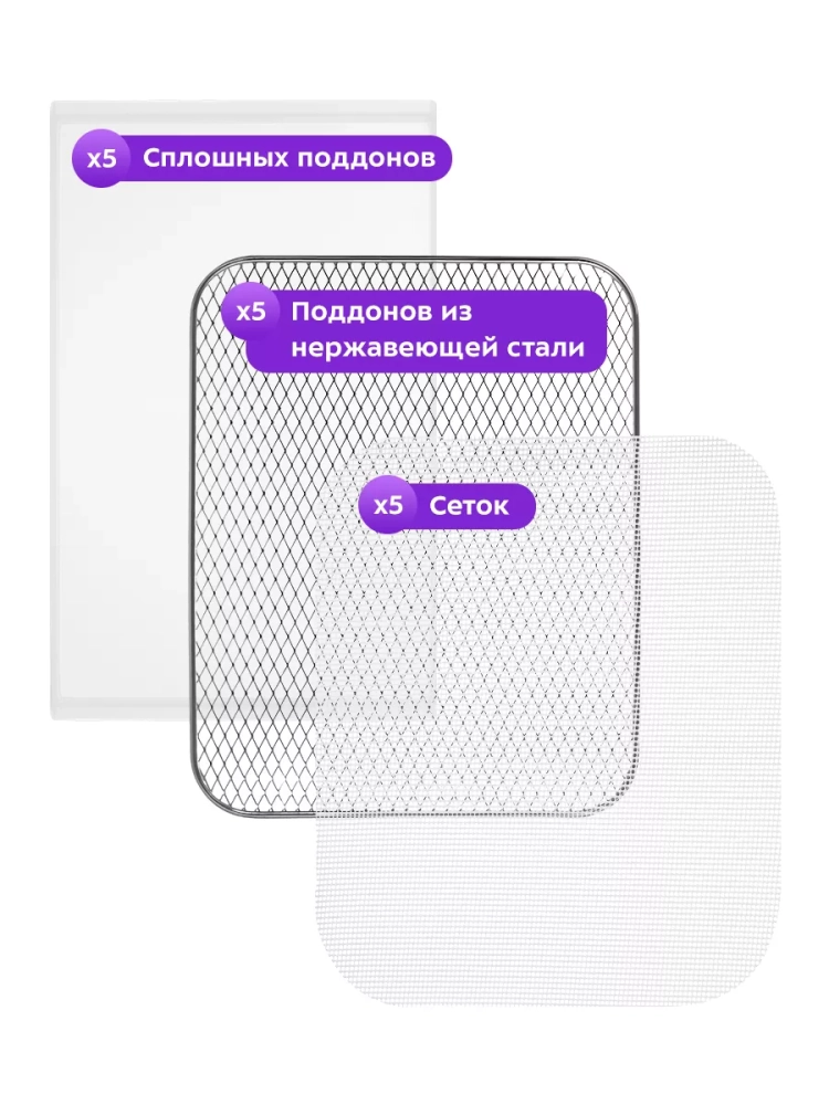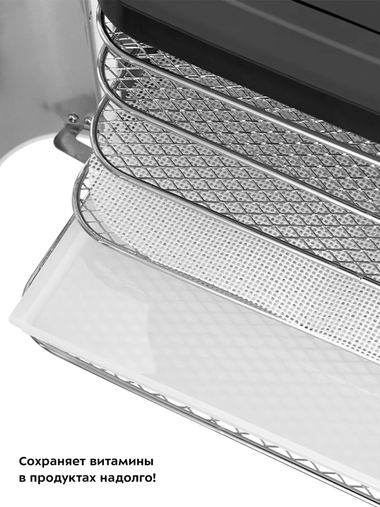 Электро сушилка оснащена пятью поддонами из нержавеющей стали, пятью сетками и пятью пластиковыми сплошными поддонами. Специальный поддон для жидкости позволяет готовить пастилу без лишних усилий. Температура сушки регулируется в диапазоне от 35 до 75 градусов Цельсия с шагом в 5 градусов, что дает возможность подобрать оптимальный режим для каждого типа продукта.