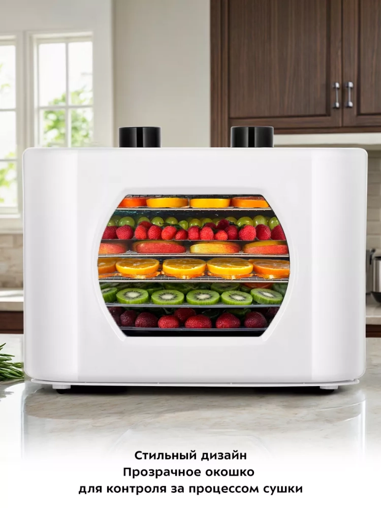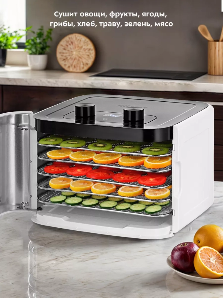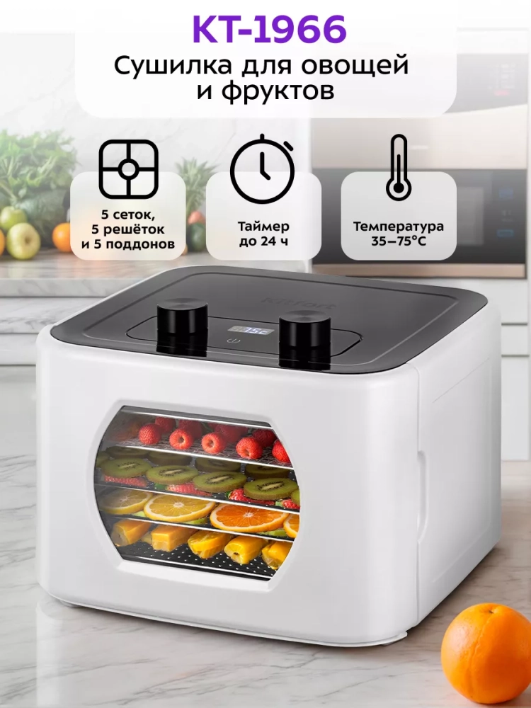 Электрическая сушилка Kitfort КТ-1966 — это идеальное решение для тех, кто ценит натуральные продукты и хочет сохранить их полезные свойства. Этот дегидратор предназначен для сушки овощей, фруктов, ягод, грибов и других продуктов. Благодаря мощному нагревательному элементу и вентилятору большого диаметра обеспечивается равномерное распределение горячего воздуха по всей камере. Это позволяет минимизировать смешение запахов при одновременной сушке различных продуктов.