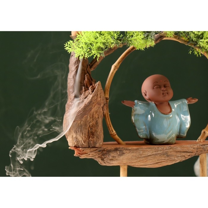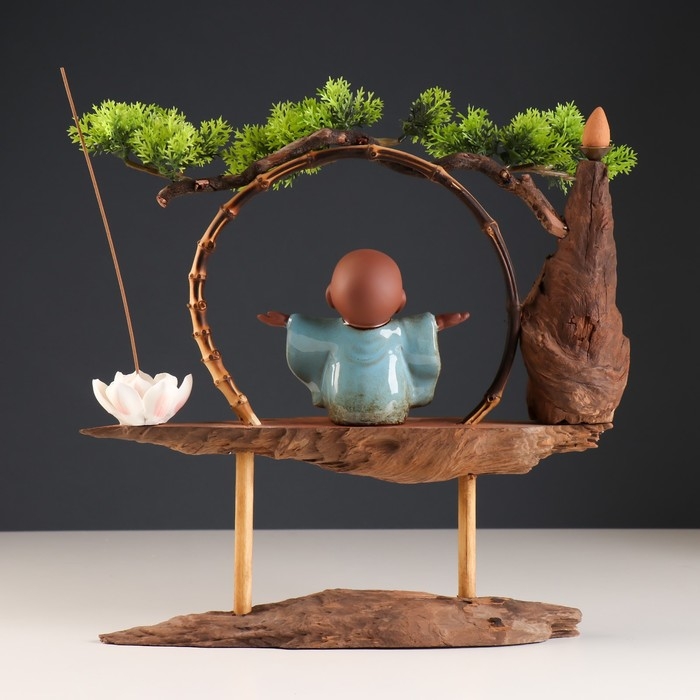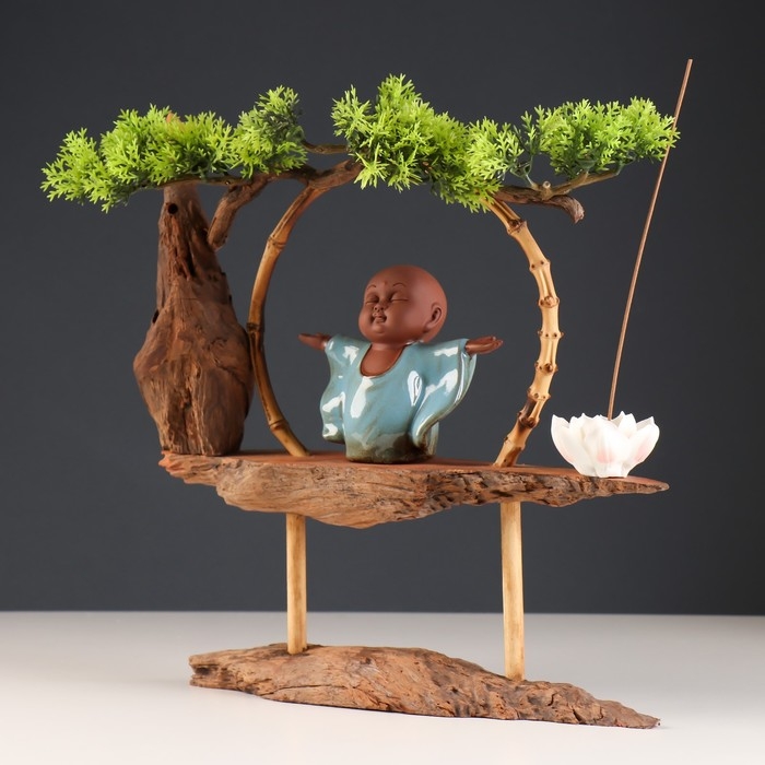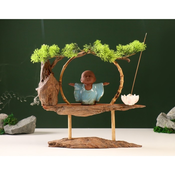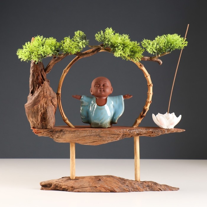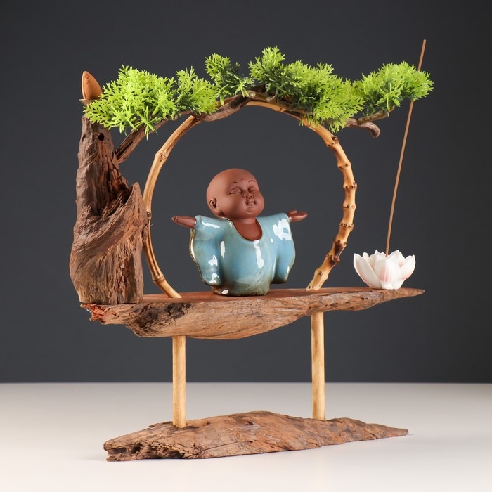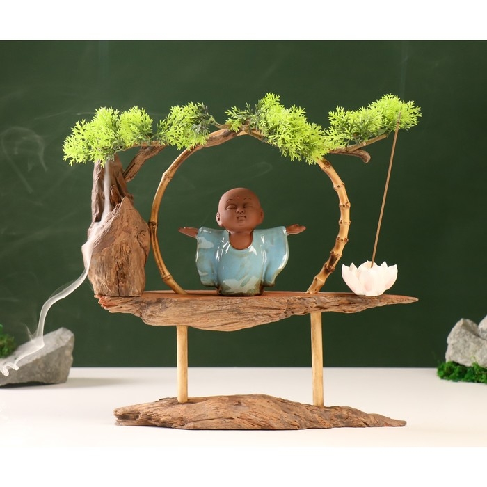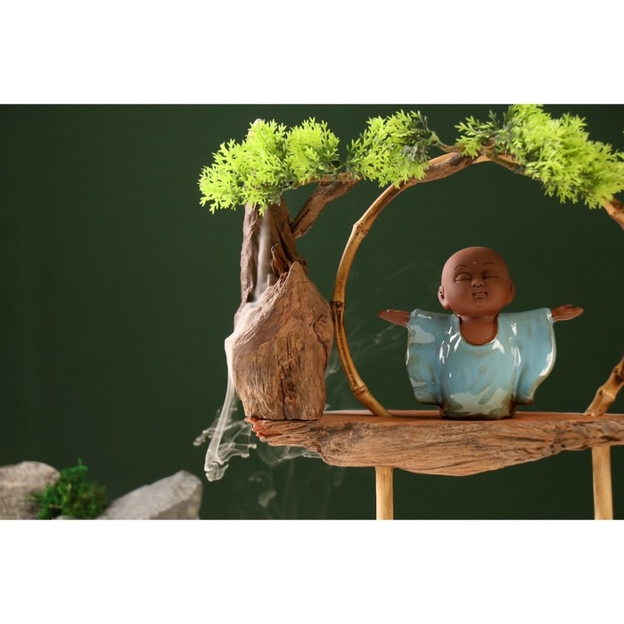 Сувенир дерево, фарфор "Маленький Будда в голубом" с подставкой для благовонии 35х35х9,5 см