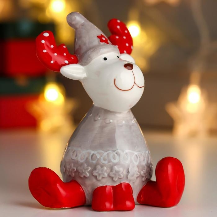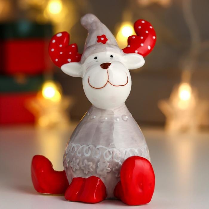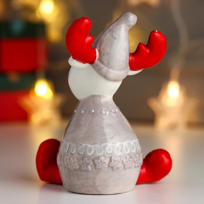 Сувенир керамика "Лосик, серый свитер и колпак, красные рожки в горох" 12х9,5х8 см