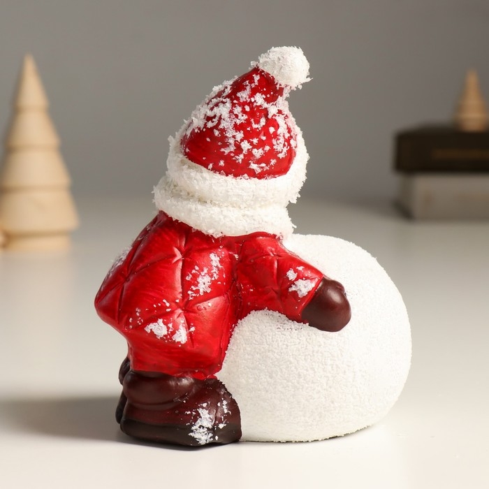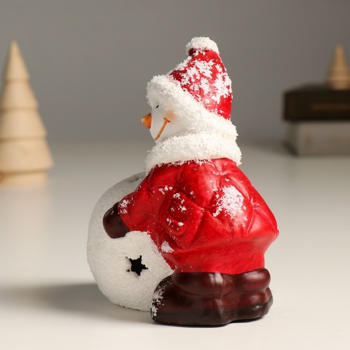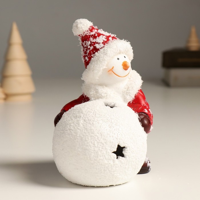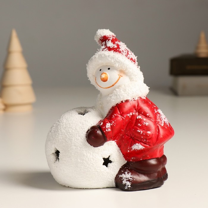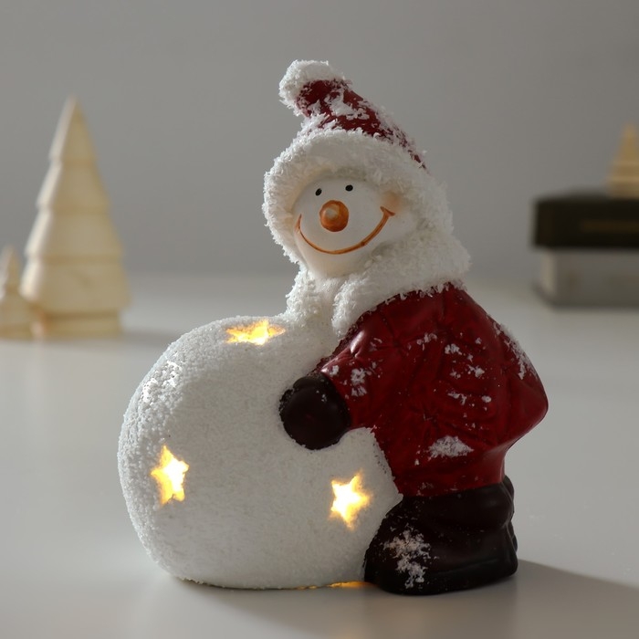 Сувенир керамика свет "Снеговик в красном пуховике со снежным шаром" 10,8х8х13,7 см