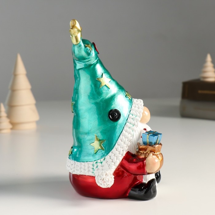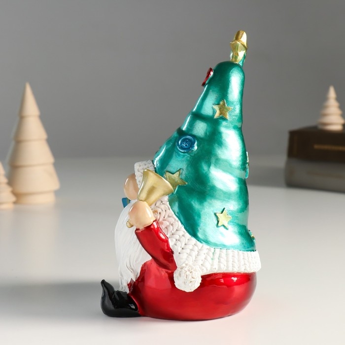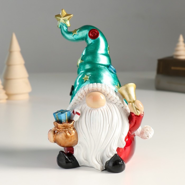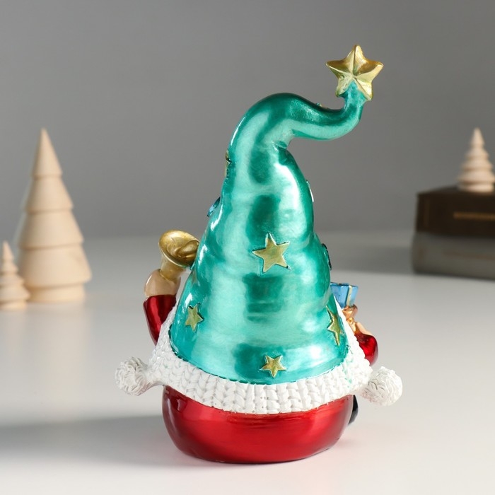 Сувенир полистоун "Дед Мороз в колпаке со звёздами, с колоколом и мешком" 12х9,5х18 см