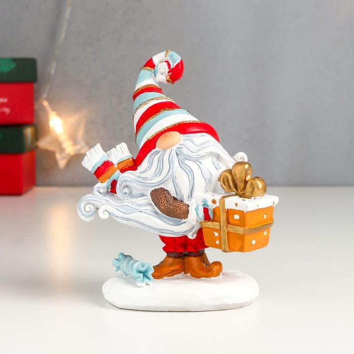 Сувенир полистоун "Дедушка Мороз с подарком, в полосатом колпаке" 13х5,5х10,5 см