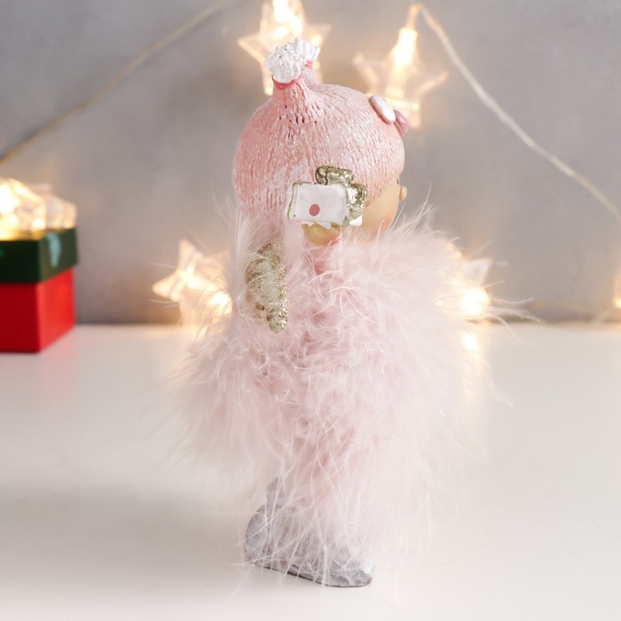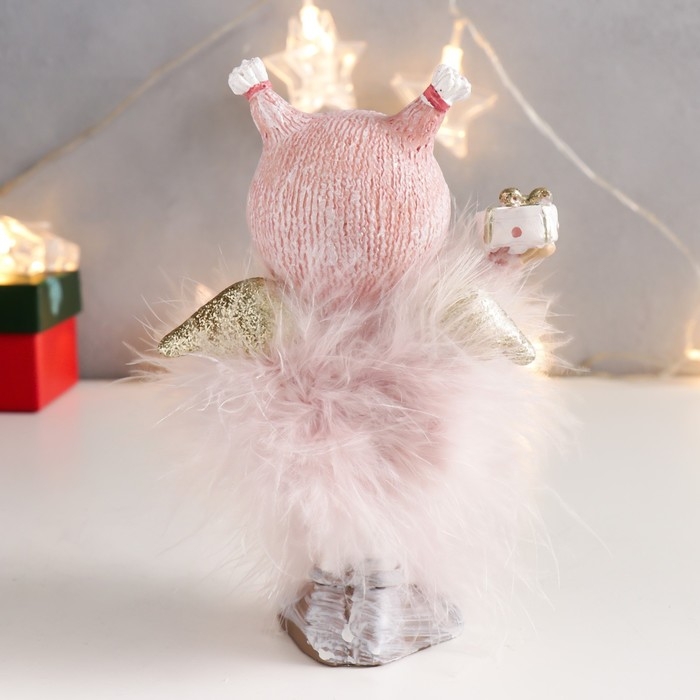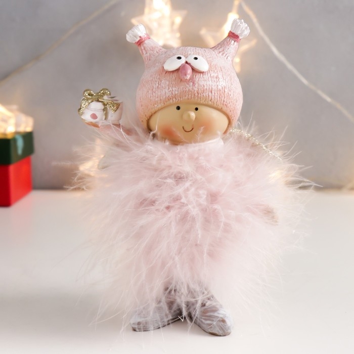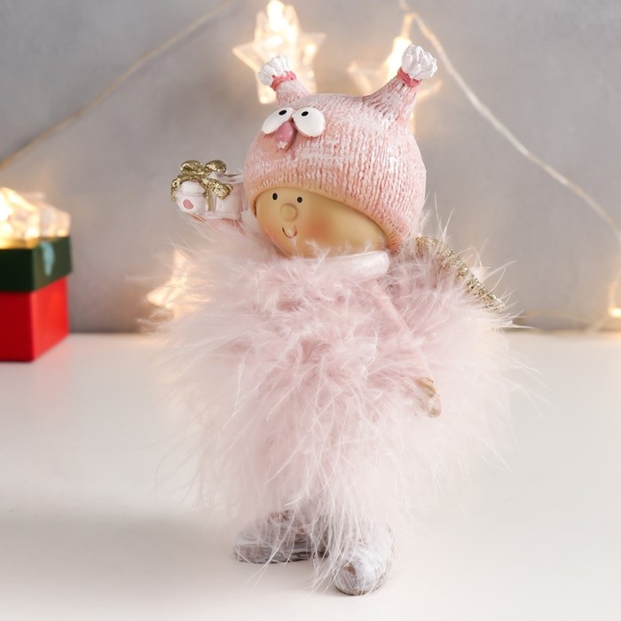 Сувенир полистоун "Малышка-ангел в розовом, в шапке совы, с подарком" пух 16,5х11х5 см