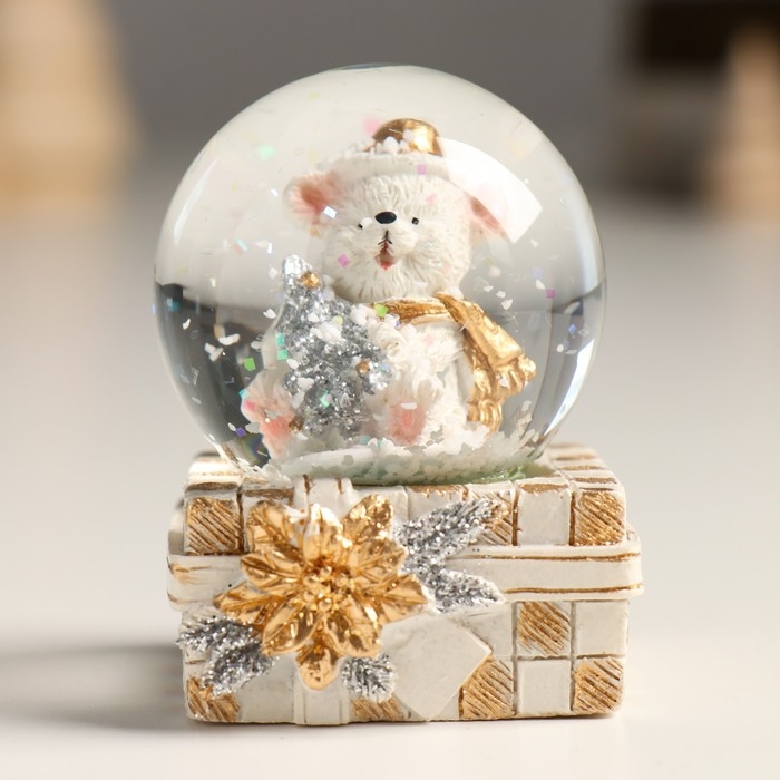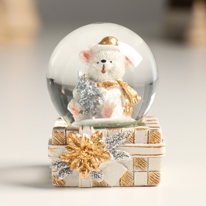 Сувенир полистоун водяной шар "Белый миша с ёлочкой в подарке" золото/серебро 4,5х4,5х6,5 см