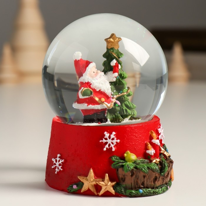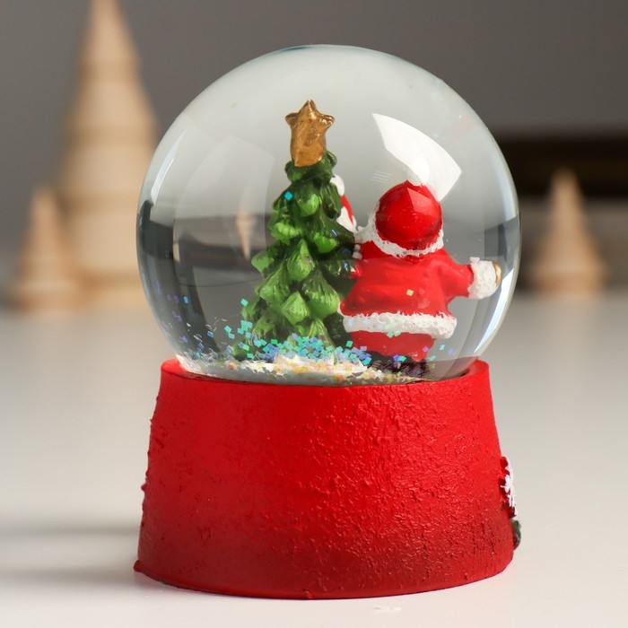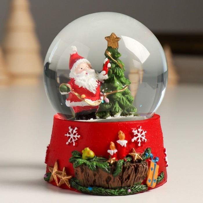 Сувенир полистоун водяной шар "Дедушка Мороз вешает гирлянду на ель" 7х8х9 см