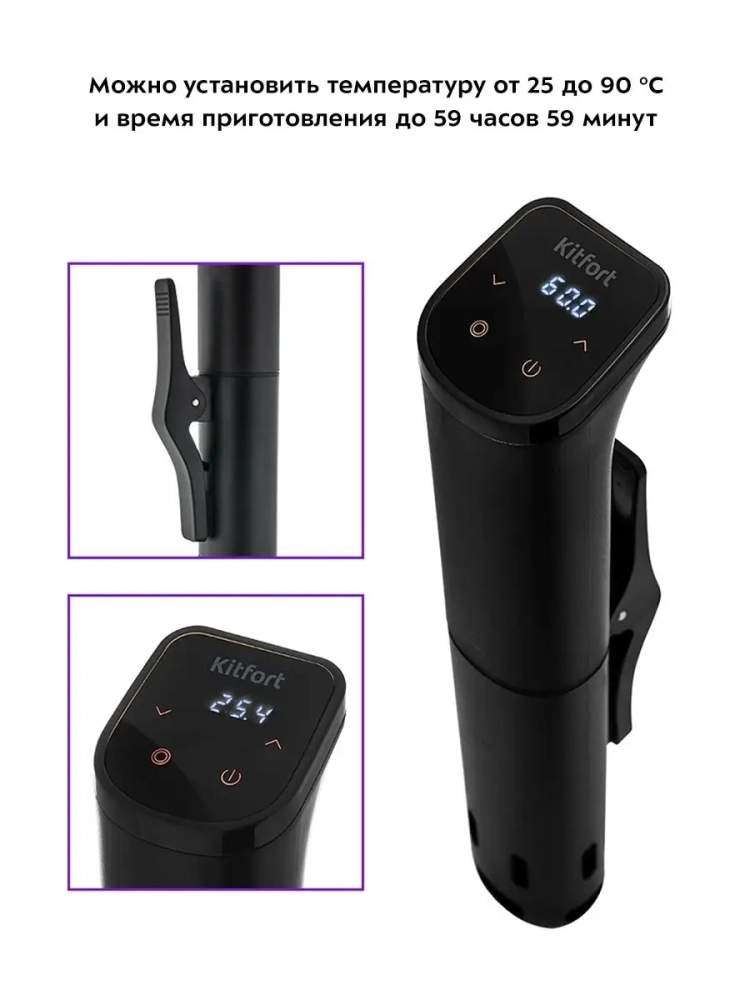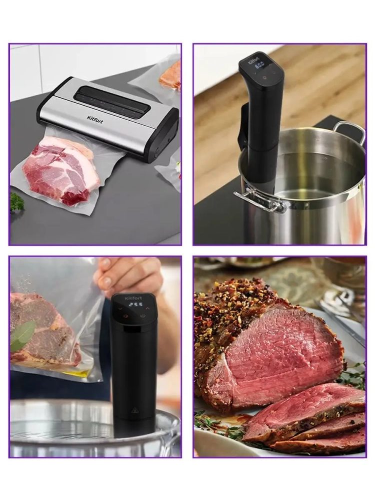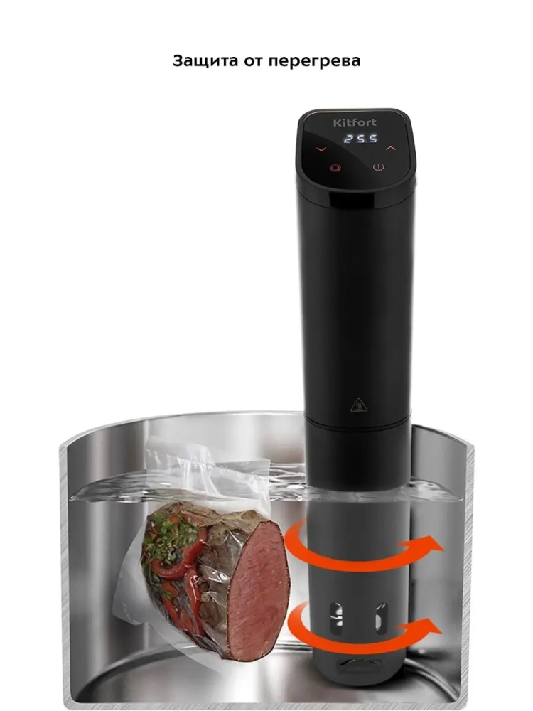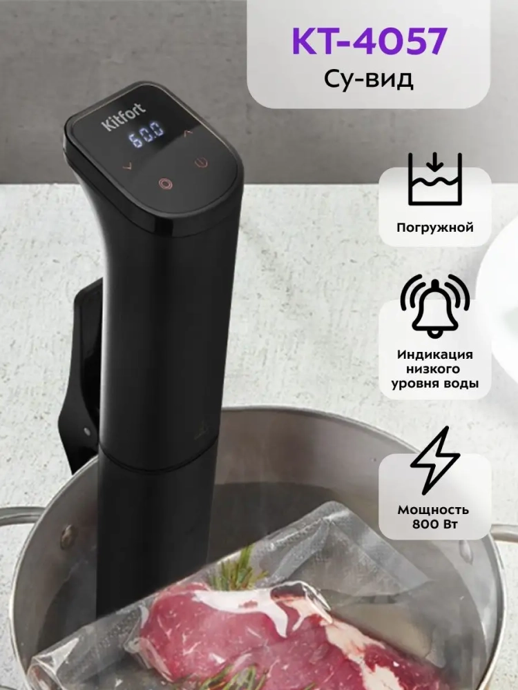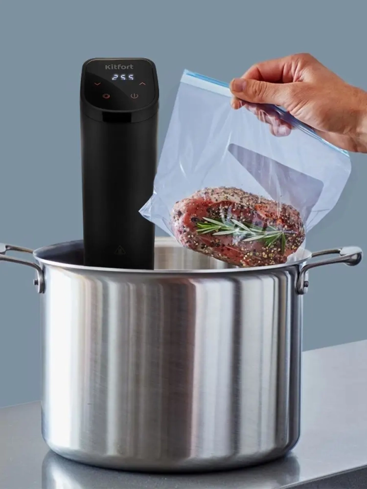 Погружной су-вид Kitfort КТ-4057 предназначен для приготовления пищи в вакуумных герметичных пакетах, помещенных в чашу с водой.